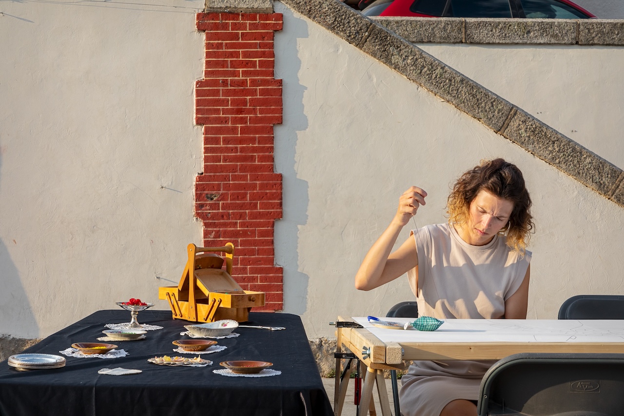 By highlighting the richness of communal craftsmanship, each afternoon a tablecloth embroidered with a map of the village will be laid out in the squares. The floral motifs traditionally found in embroidery will be replaced with real flowers, which can be sewn onto the map-cloth—allowing anyone who wishes to join to stitch their own decisions into the greening of their town.