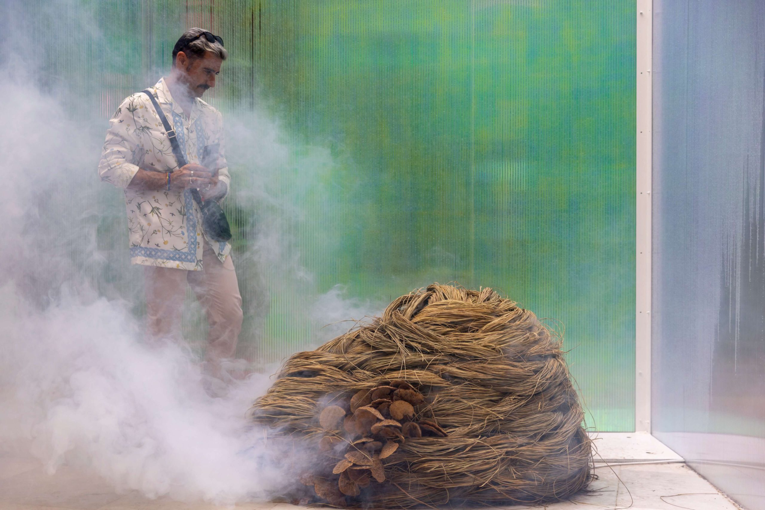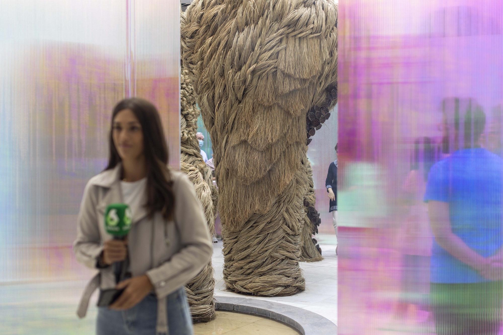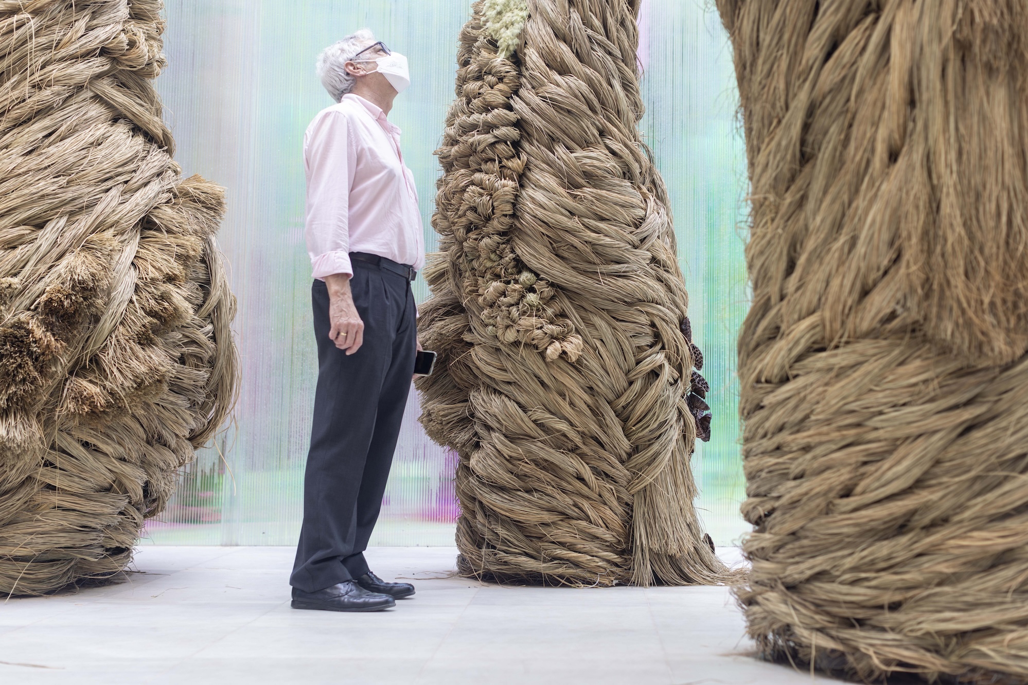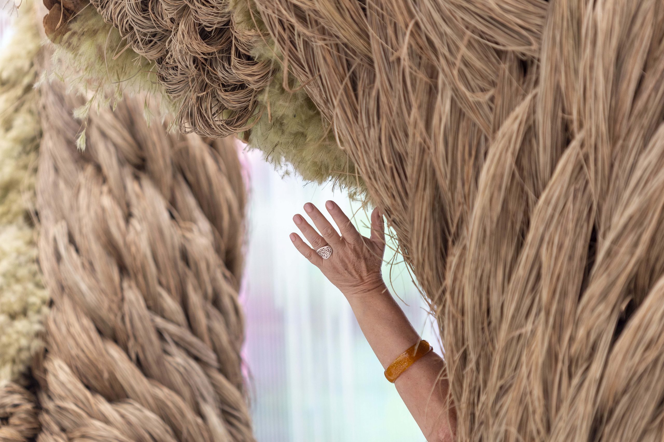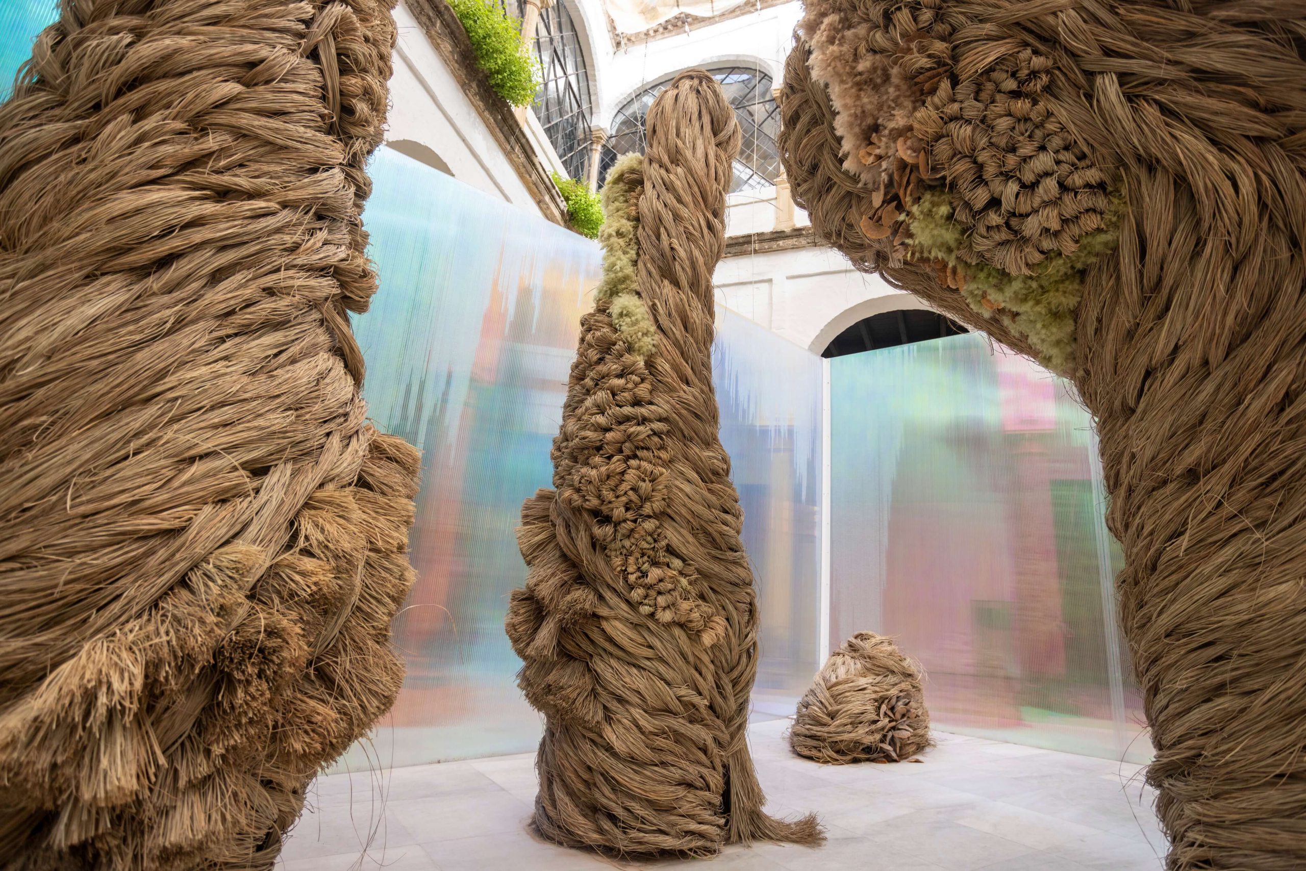 Beauty can teach us to look differently at the most ordinary materials, such as humble esparto grass. The usual whiteness of the Orive Palace courtyard has undergone a metamorphosis of color, leading us to question what we are seeing. Who are these creatures glimpsed through the mysterious filter? Remnants of a landscape? Giant animals at rest? Or perhaps vegetal masses transmuted into beasts?