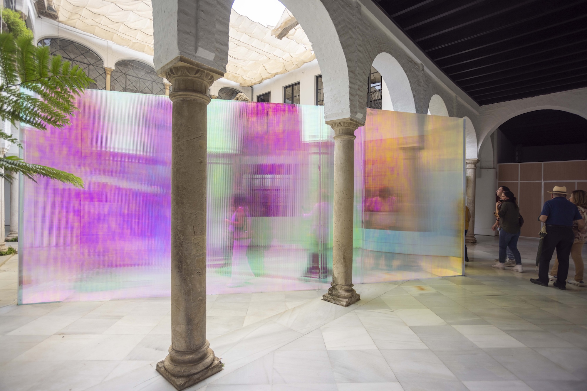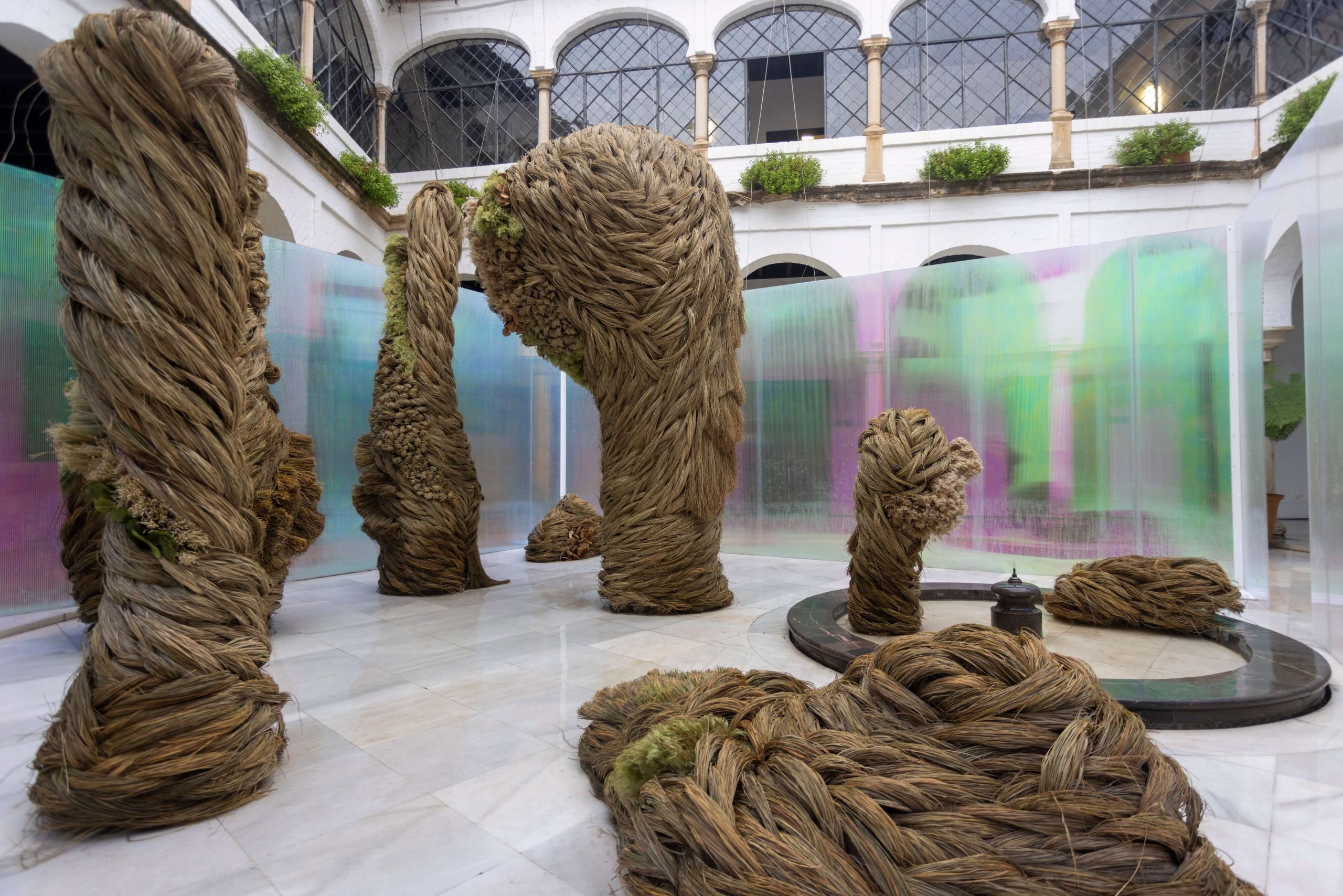La belleza nos puede enseñar a mirar de otro modo los elementos más cotidianos, como el sencillo esparto. La habitual blancura del patio del Palacio de Orive se ha convertido en una metamorfosis de color que nos hace dudar de lo que vemos. ¿Quiénes son esas criaturas que intuimos a través del misterioso filtro? ¿Resquicios de un paisaje? ¿Enormes animales en reposo? ¿O acaso masas vegetales transmutadas en animal?